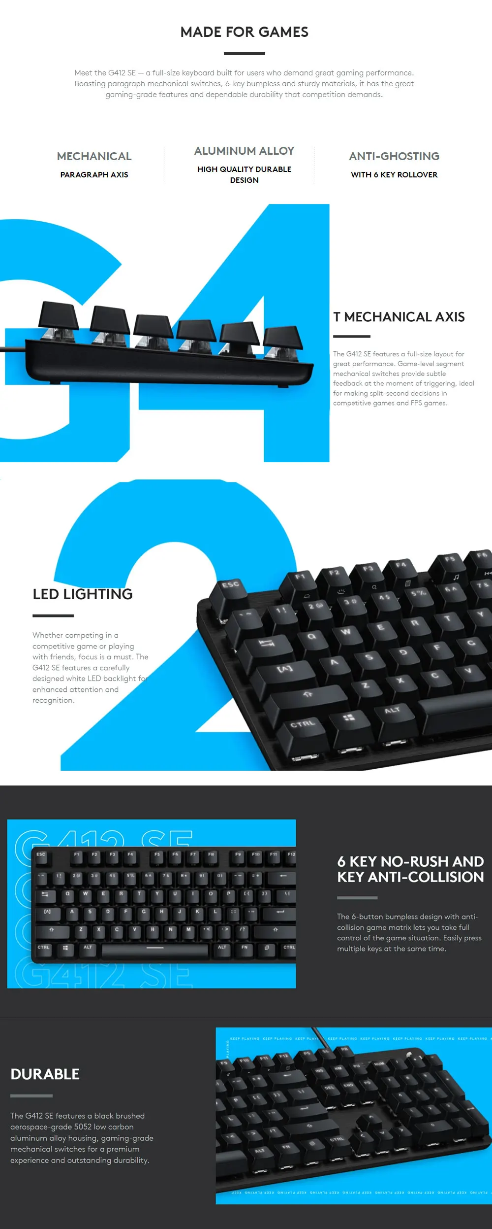 - Take your gaming skills to the next level: Logitech G412 SE (Special Edition) is a full-size keyboard with gaming-first features and the durability and performance necessary to compete