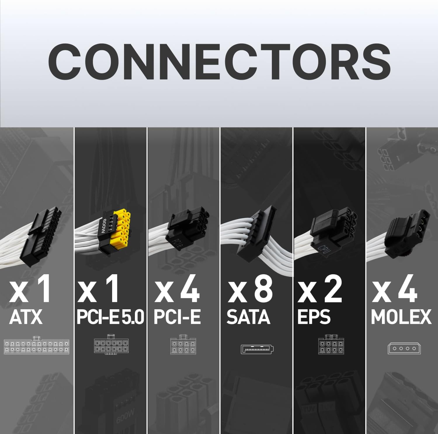 With a 16-PIN PCIe connector, this PSU supports Nvidia 40 Series graphics cards.