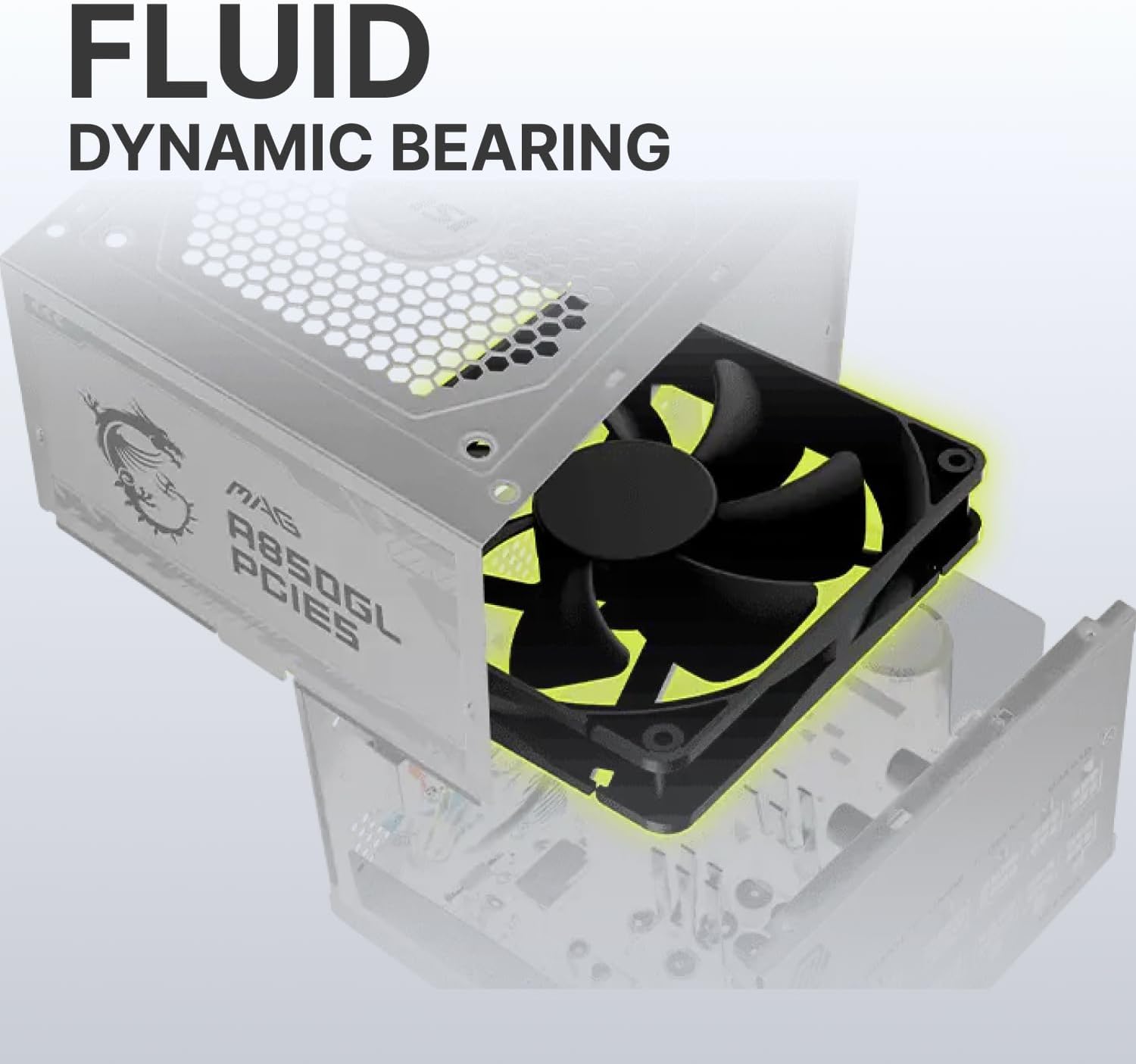 The power supply’s fan incorporates a fluid dynamic bearing, achieving an optimal balance between cooling performance and noise levels.