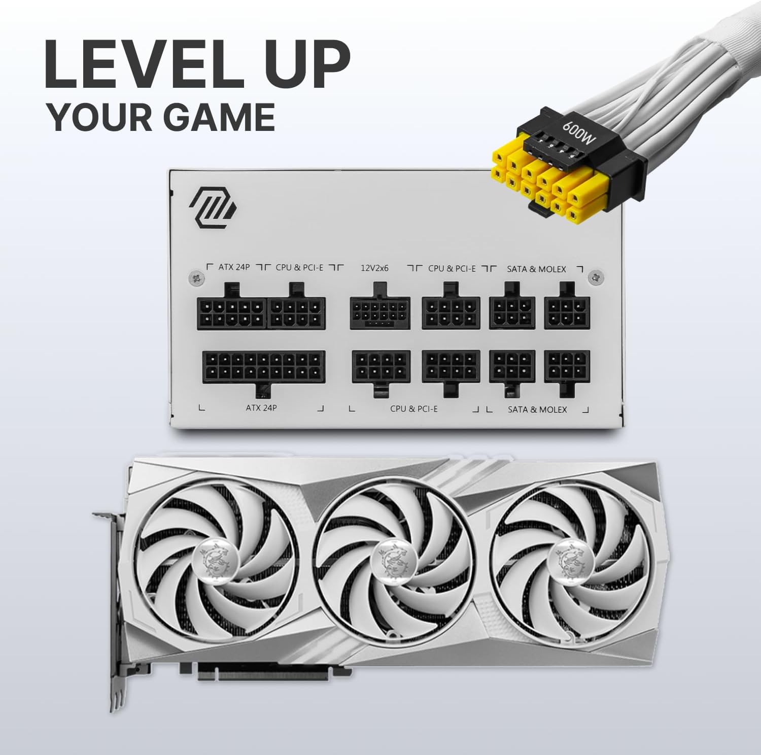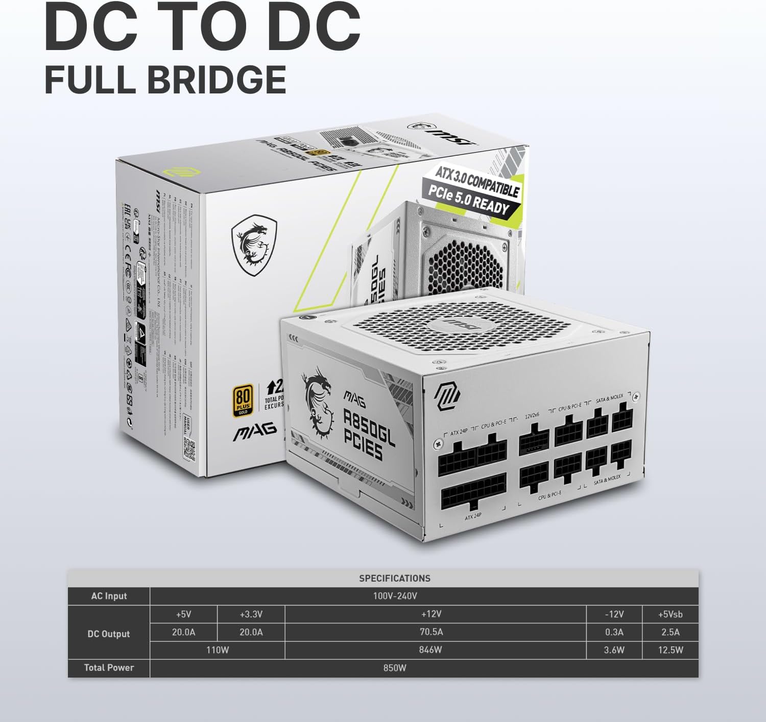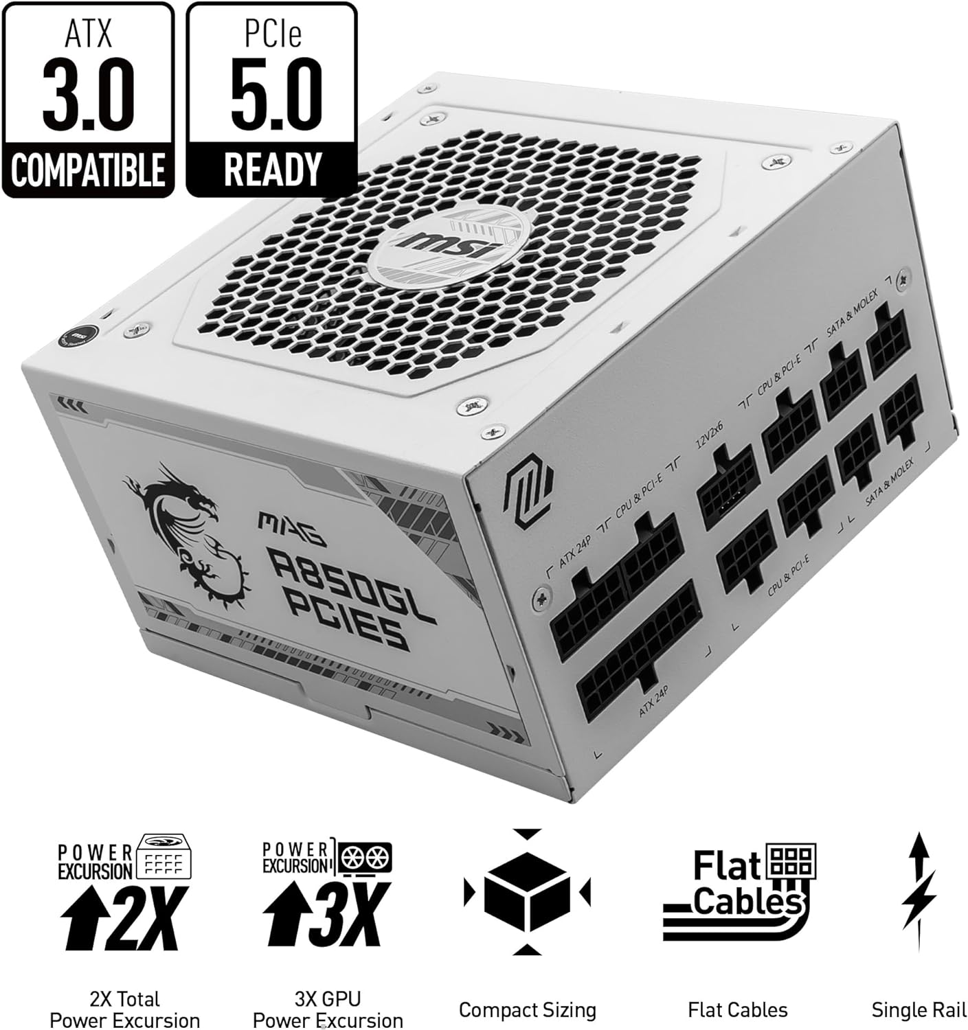 MSI MAG 850GL PCIE 5 White Gaming Power Supply – Full Modular – 80 Plus Gold Certified 850W – Compact Size – ATX PSU