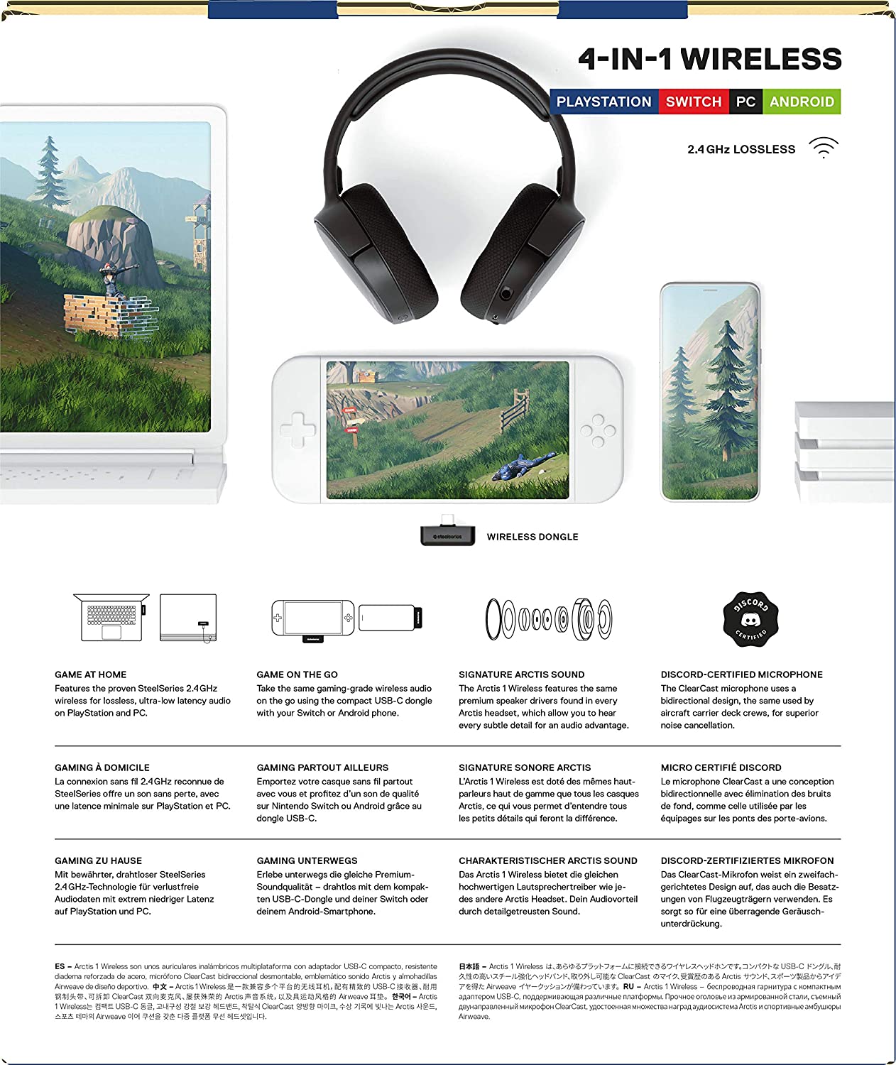 The Arctis 1 Wireless is a gaming-grade wireless headset designed for PC, PS4, Switch, and android thanks to an innovative USB-C dongle design, making it perfect for gaming at home or on the go. Its sleek and lightweight design includes the same high quality speaker drivers and microphone tech as the critically acclaimed Arctis 7, so you can bring the award-winning performance of Arctis anywhere